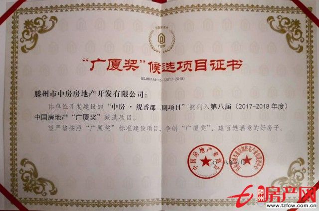 2018年6月22日,令房地產業界特別關注的第八屆(2017—2018年度)中國房地產“廣廈獎”第四批候選項目頒牌儀式在青島隆重舉行,由滕州市中房房地產開發有限公司開發建設的“中房緹香郡二期項目”獲此殊榮。