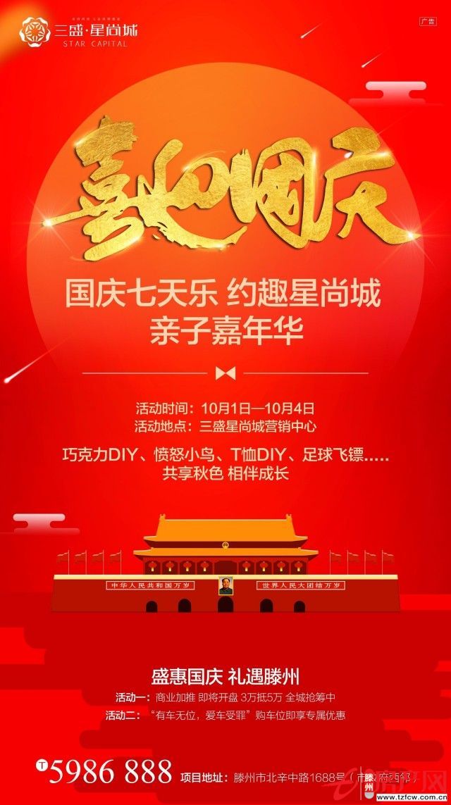 盛惠國慶,禮遇滕州,國慶鉅獻,一鋪難求。商業加推,即將開盤,3萬抵五萬,全城搶籌中(此優惠不與其他優惠政策疊加)!稀缺車位,限時特價,0首付,總價低,國慶給愛車一個家(贈送2000元儲藏室券)!