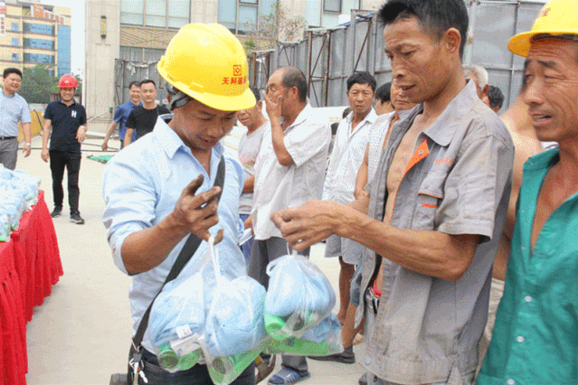 為了確保建筑工人的身體健康與項目生產安全,君瑞城黨支部開展了“夏季送清涼”活動。君瑞城項目總經理陳盛東、副總經理徐翔、總經理助理陸成相和建設方天科建設負責人,為奮戰在高溫下的一線工人送去“夏日清涼套裝”——毛巾、肥皂、洗發水和花露水。
