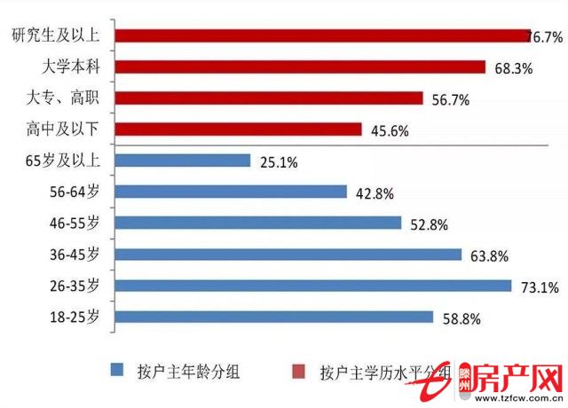 從學歷和年齡看,居民家庭負債集中于中青年和高學歷家庭。戶主年齡為26~35歲的家庭負債參與率最高,家庭負債參與率與戶主的學歷成正比,戶主受教育程度越高,家庭負債參與率越高。
