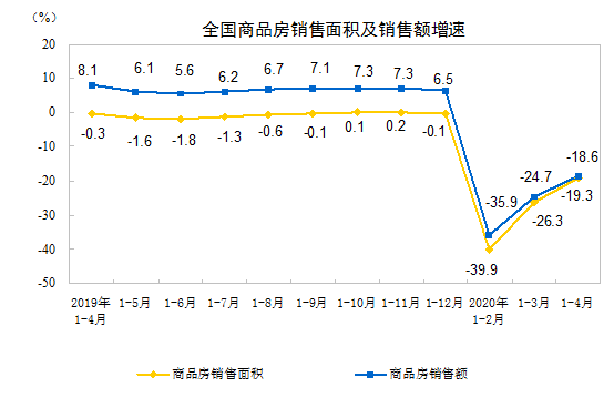 1—4月份,商品房銷售面積33973萬平方米,同比下降19.3%,降幅比1—3月份收窄7.0個百分點。其中,住宅銷售面積下降18.7%,辦公樓銷售面積下降32.0%,商業營業用房銷售面積下降29.1%。商品房銷售額31863億元,下降18.6%,降幅比1—3月份收窄6.1個百分點。其中,住宅銷售額下降16.5%,辦公樓銷售額下降37.5%,商業營業用房銷售額下降34.5%。