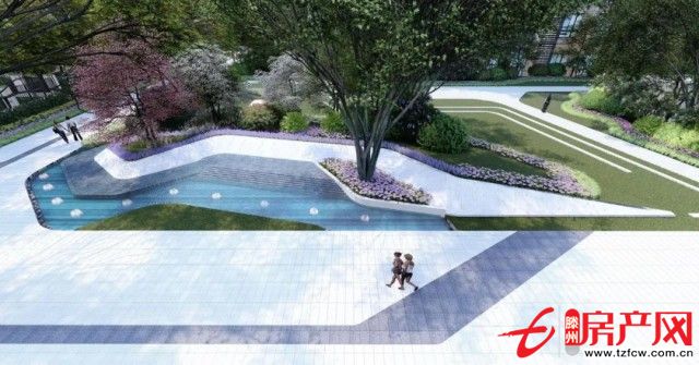 新亞洲風格水景點綴于園林之中,幾何形狀的線條勾勒呈現出別致的美感。樹縫中透進的陽光若隱若現的落在水景之上,微風拂過激起片片漣漪,在光與影的交織中,讓歸家的腳步變得更加輕盈。