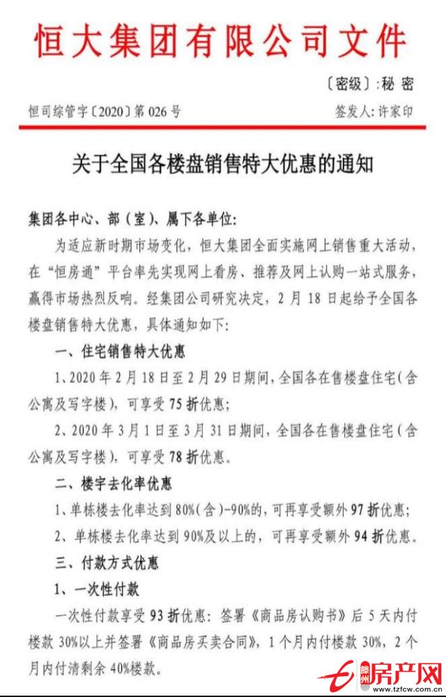 今年2月,恒大在啟動網上銷售特大優惠活動中,提出參考去化率打折的優惠方式:單棟樓去化率達80-90%的,可享額外97折優惠;單棟樓去化率90%以上的,可享額外94折優惠。也就是說,如果項目去化接近尾聲,那么就通過加大折扣的方式來加速庫存去化,這種優惠方式,一直延續到3月底。