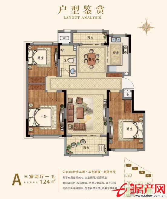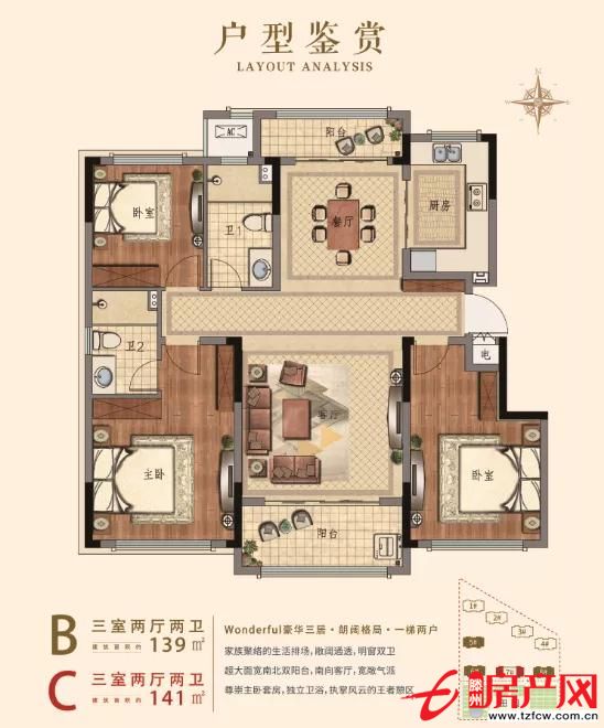 住宅采用人性化設計,有90㎡、124㎡、139㎡等戶型,做到面積適中,全透全明,南北通透,動靜分區,景觀雙陽臺,落地大窗,讓住戶充分享受田園風光。