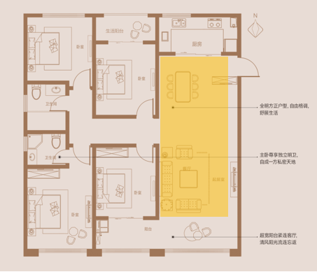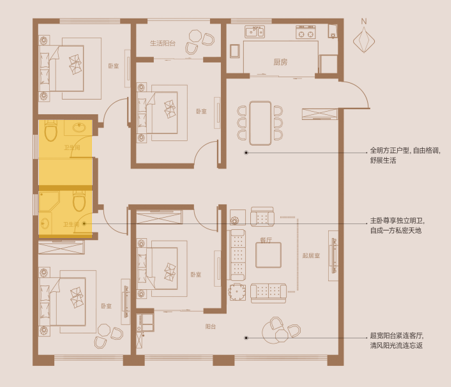 獨立雙衛,拜托擁擠,避免早晚洗漱高峰期,生活更加便捷。家人生活更舒適,主臥專屬衛生間,提高生活的隱秘性,帶來尊貴的舒居體驗,方能彰顯日常的品質生活。