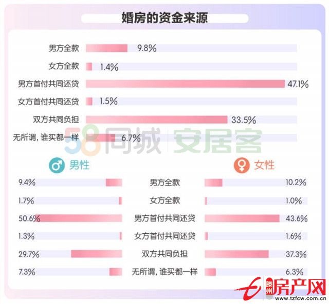 購房是成家過程中的重大開銷,掏空“六個錢包”的現象也不少見。在58同城、安居客的調研中,有47.1%的人表示婚房是由男方出首付,雙方共同還貸來解決。此外,選擇婚房資金由雙方共同負擔的占比也有33.5%。安家不是某一方的義務,而是需要男女雙方共同承擔起責任,共同還貸成為時下最多家庭的選擇。