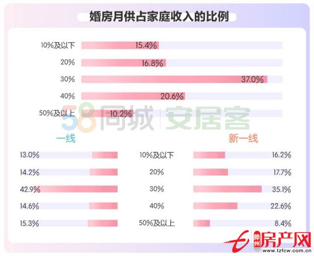 58安居客房產研究院調查顯示,男性愿意自己承擔首付,雙方共同還貸的占比超五成;作為新時代獨立女性的表現也絲毫不亞于男性,愿意共同負擔購房款的占比為37.3%。對于婚房的月供,有近六成的調研人群表示月還款額在家庭整體收入的30%-40%左右,一線城市中月供占收入50%以上的占比15.3%,可見要想過上舒適型生活月供占比不宜太高。