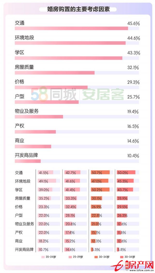買房無小事,特別是對于新婚夫妻來說,房子買在哪里需要考量的因素也更復雜。58同城、安居客《2020年都市男女婚房置業報告》指出,新婚夫妻在選擇婚房時,交通、環境地段、學區這三項是多數購房者優先考慮的因素,占比均超過40%。相比90后,80后的購房者對于學區房的關注度相對更高;90后則更看重物業及服務;90后中,超一成的人表示選擇婚房時也很看重開發商的品牌,考慮房屋質量的人群占比也高于80后。