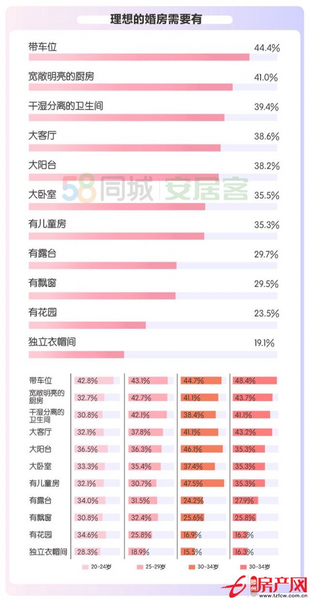 理想的婚房很豐滿,也充滿了對未來高品質生活的追求。58同城、安居客《2020年都市男女婚房置業報告》數據顯示,選擇要有車位的購房者占比最多,為44.4%,此外,寬敞明亮的廚房及干濕分離的衛生間也排在靠前的位置。從年齡上看,年輕的90后更注重自身居住的舒適性,20-24歲的購房者選擇獨立衣帽間的占比在28.3%,對于飄窗的需求也要高于80后;相比對于獨立衣帽間、飄窗等,80后對于大客廳、大陽臺的需求明顯高于90后,此外,80后則更多為下一代考慮,選擇“有兒童房”的30-34歲購房者占比47.5%。