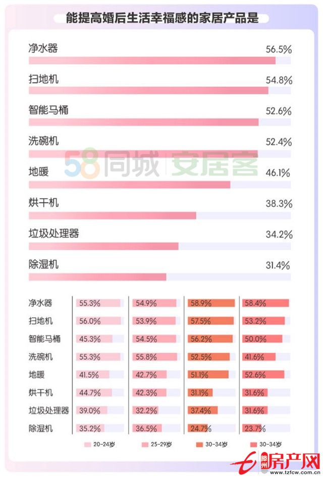 婚前的激情與浪漫、婚后的柴米油鹽,都是美好生活的一部分。為讓平淡的生活變得更浪漫,小夫妻在購置家居用品時會有更多考慮。58同城、安居客關于都市男女婚房置業的調研中,80后、90后普遍認為能提高婚后生活幸福感的家居產品包括凈水器、掃地機、智能馬桶和洗碗機。90后對洗碗機的需求相比80后來說普遍更高,對于洗碗機的需求占比過半;80后則對地暖相對更感興趣。