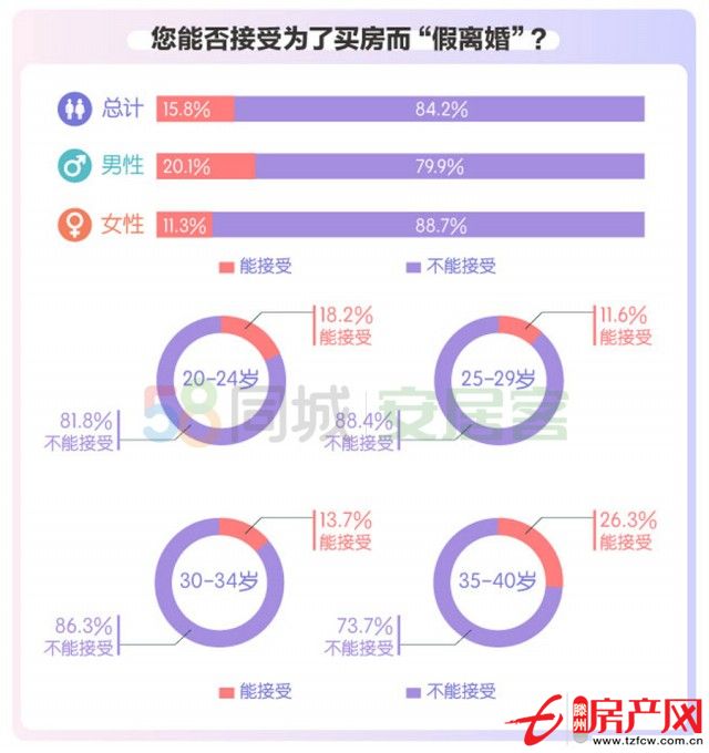 有人說,婚姻是神圣的,不可當兒戲;也有人說,在房價面前,不得不低頭。動輒數百萬的差價,有些人選擇用“假離婚”來換取首套房的購房資格。面對這個問題,58安居客房產研究院調研結果顯示,有84.2%參與調研的人選擇了“不能接受”,其中女性不能接受“假離婚”的占比88.7%。從年齡上看,35-40歲的80后選擇“能接受”的26.3%的占比相對較高。實際上,離婚沒有真假一說,若是弄假成真,必將得不償失。