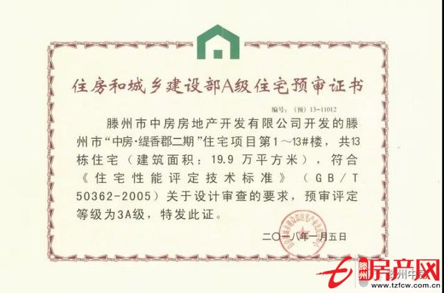 2、通過住建部“3A住宅性能認定”。2018年1月5日,中房·緹香郡璟園項目經國家住建部住宅性能認定專家組評審,項目在適用性能、安全性能、耐久性能、環境性能和經濟性能等五項指標均符合國家《住宅性能評定技術標準》要求,認定項目通過國家住建部“3A住宅性能認定”初審。
