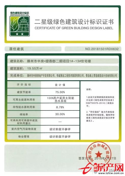 3、獲山東省二星級綠色建筑標識2018年4月,經山東省住建廳評審,中房·緹香郡璟園項目獲得居住建筑類二星級綠色建筑設計標識。