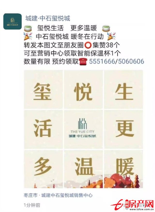 這個冬天,溫暖滕州,城建·中石璽悅城在行動!即日起,在朋友圈轉發城建·中石璽悅城暖冬活動圖文,集齊38個贊,即可在11月21日—22日至營銷中心領取智能保溫杯1個。