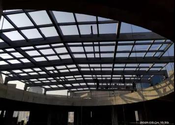 2#、3#樓玻璃幕墻安裝完成95%,空調機位百葉安裝完成;1#樓西側采光頂鋼架安裝完成;1#樓石材龍骨安裝基本完成。