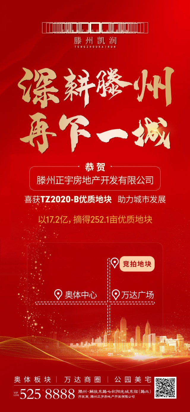 5月28日上午11:00時,滕州正宇房地產開發有限公司以總價17.2億競得宗地TZ2020—B號地塊。該地塊位于龍泉北路東側、紅荷路南側、荊泉路西側、陶山路北側,是繼凱潤花園項目之后,在滕州的又一精品之作!