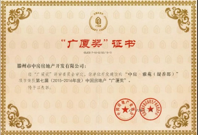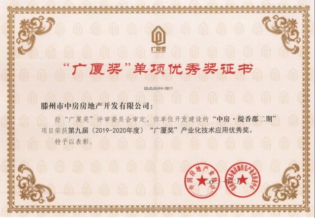 2016年,中房緹香郡項目初獲第七屆“廣廈獎”,2021年緹香郡璟園項目獲第九屆“廣廈獎”,再到中房九里庭院項目成功入圍第十屆“廣廈獎”第一批候選項目,這不僅是中房地產人的驕傲,也是全市房地產業的榮譽,更是市場對中房地產的高度肯定。