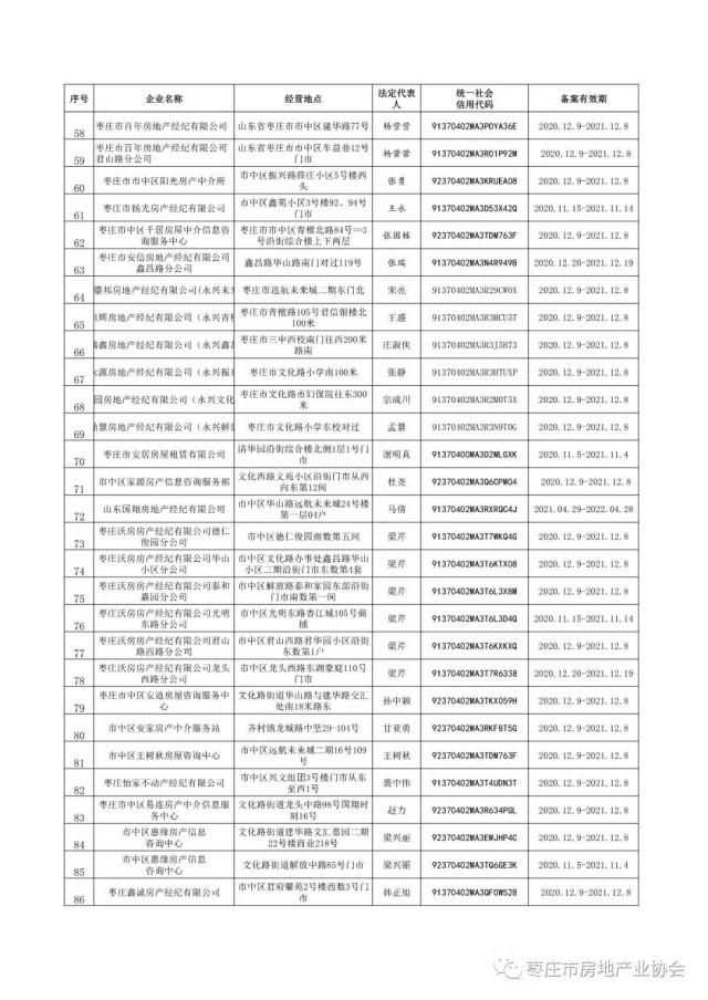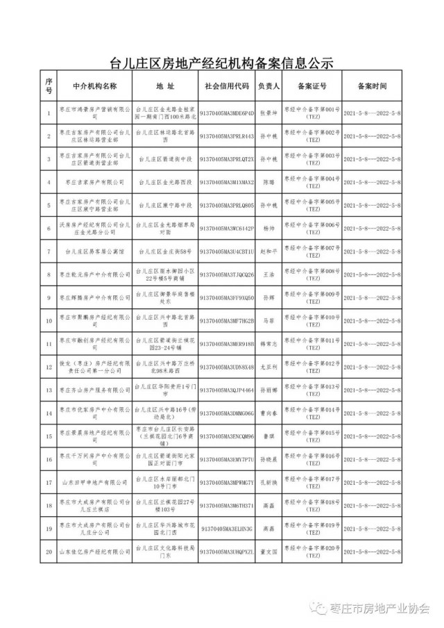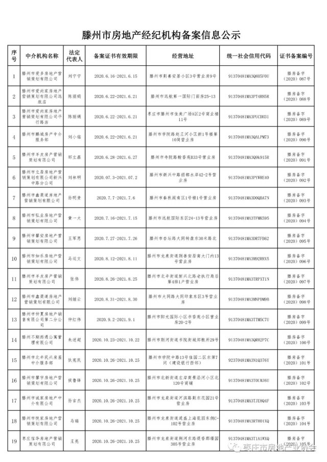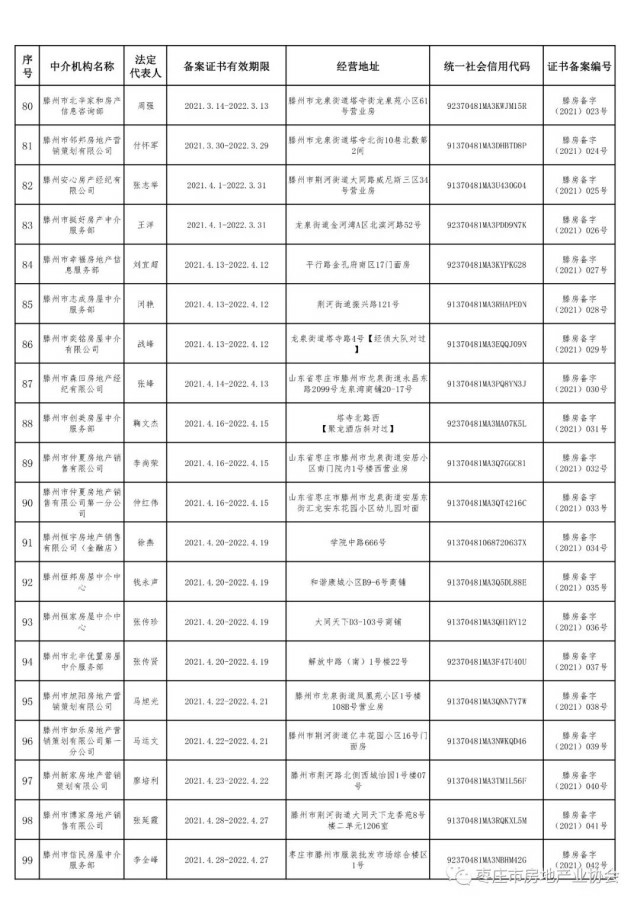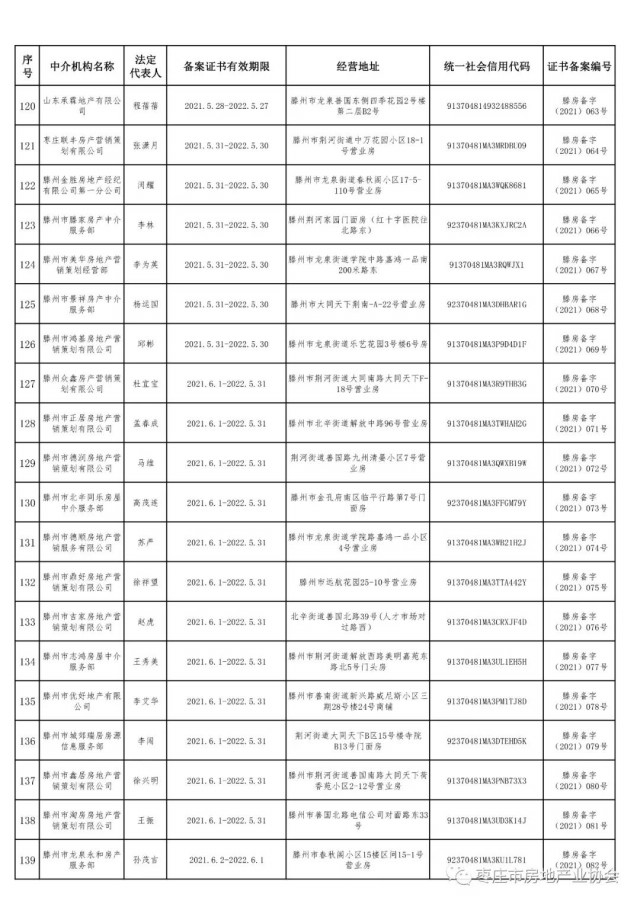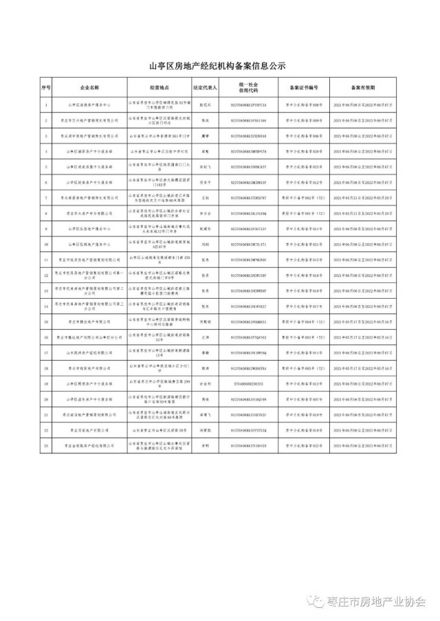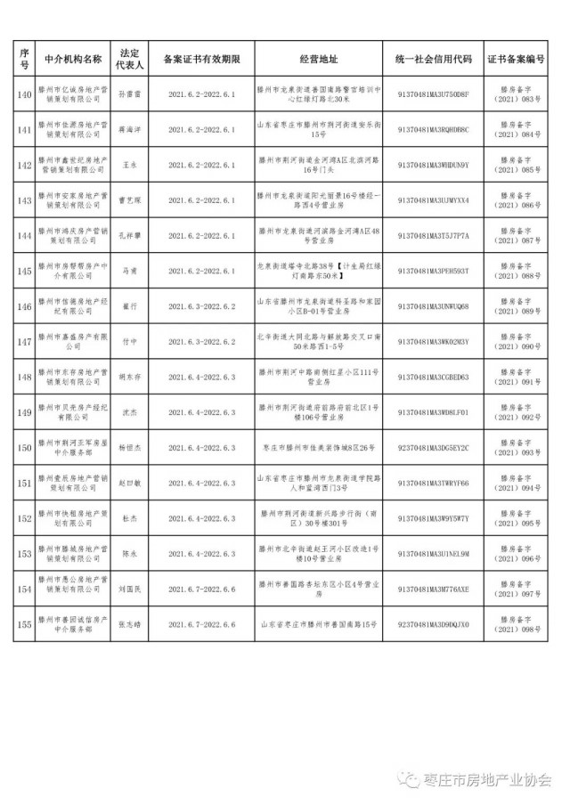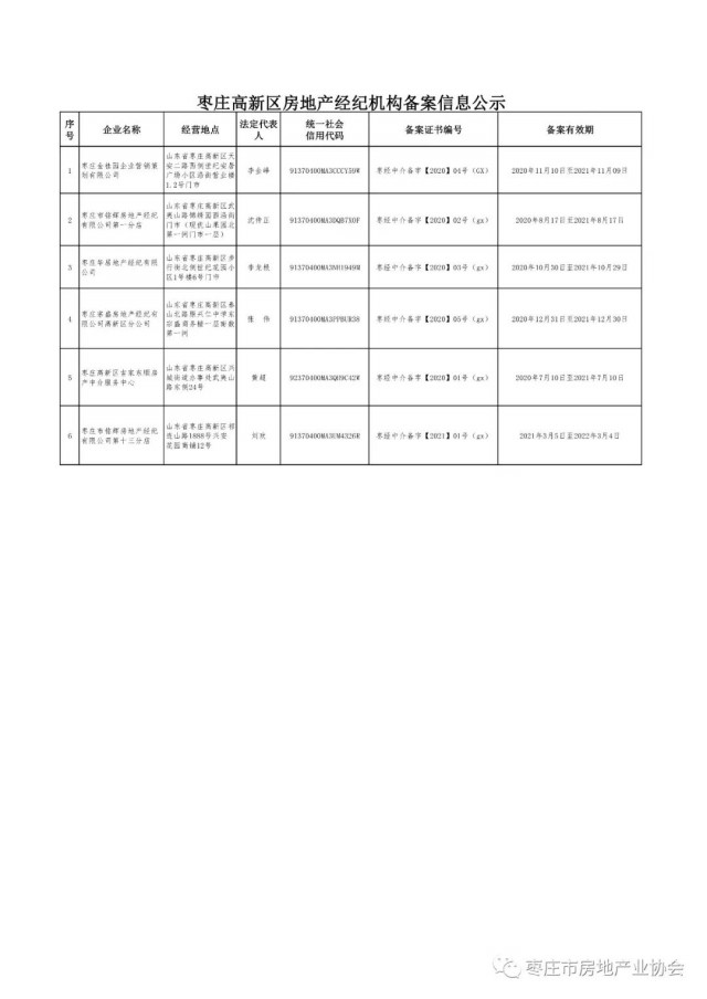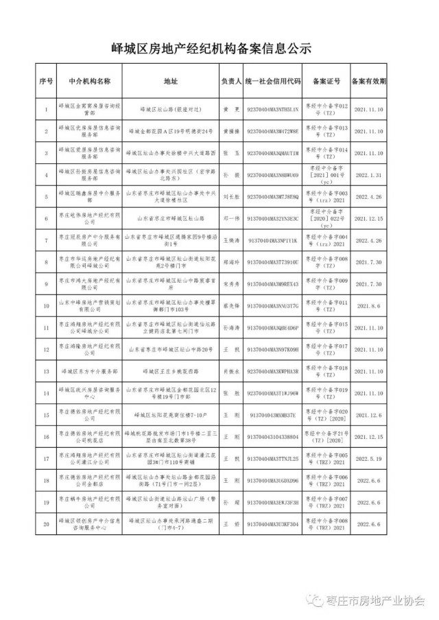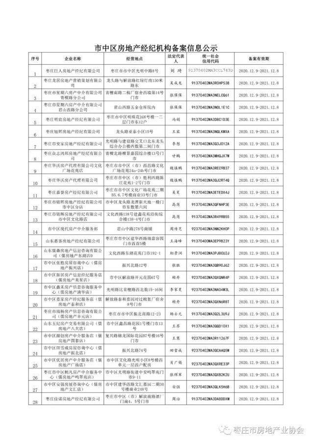為切實加強我市房地產經紀機構管理,規范房地產經紀活動,保障房地產經紀活動當事人合法權益,維護房地產中介市場秩序,根據棗莊市住房和城鄉建設局《關于進一步加強房地產中介市場管理的通知》(棗住建字〔2020〕1號)文件精神,截至2021年6月15日,經各區(市)、棗莊高新區主管部門核準取得《棗莊市房地產經紀機構備案證書》的房地產經紀機構(門店)共416家,其中,滕州市155家,薛城區94家,山亭區23家,市中區86家,嶧城區20家,臺兒莊區32家,棗莊高新區6家,現予以公示。