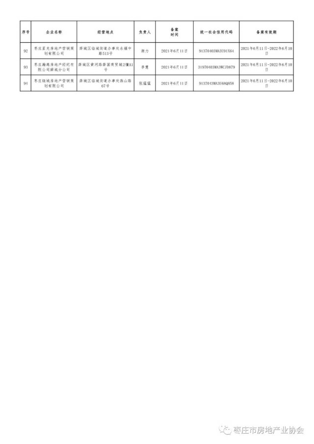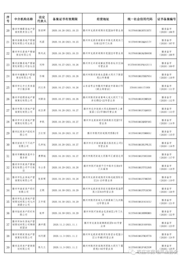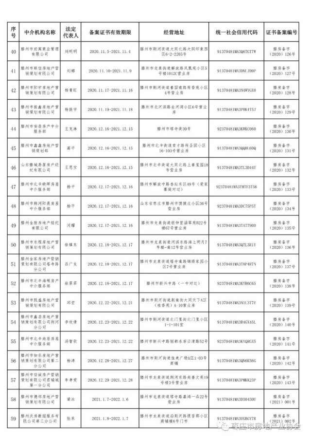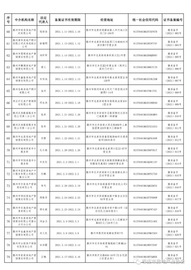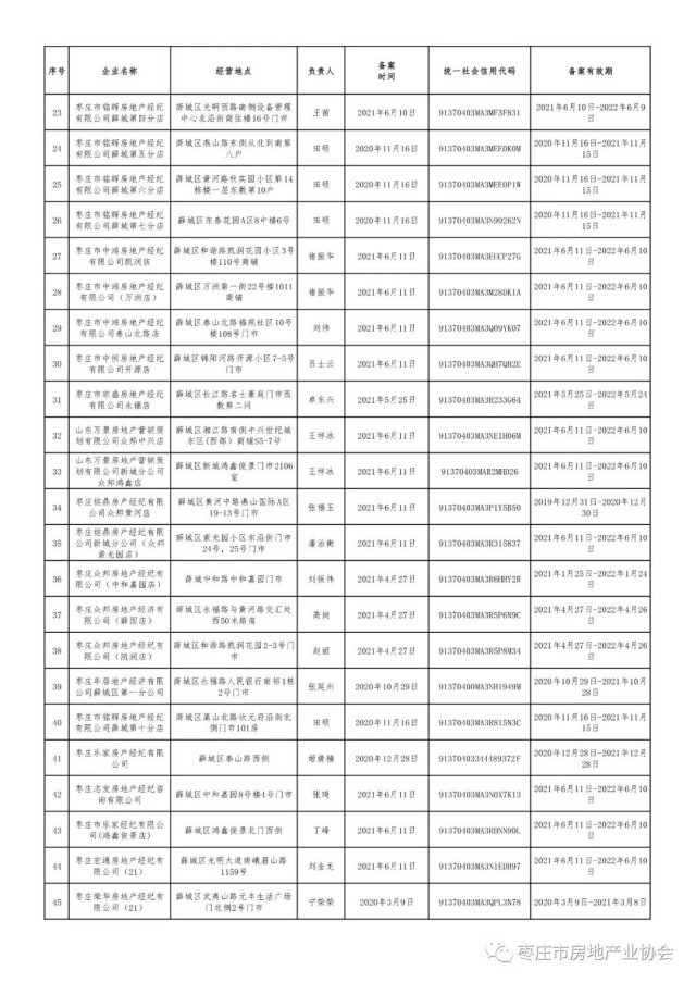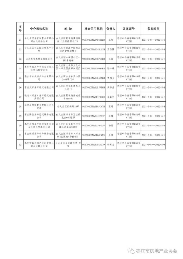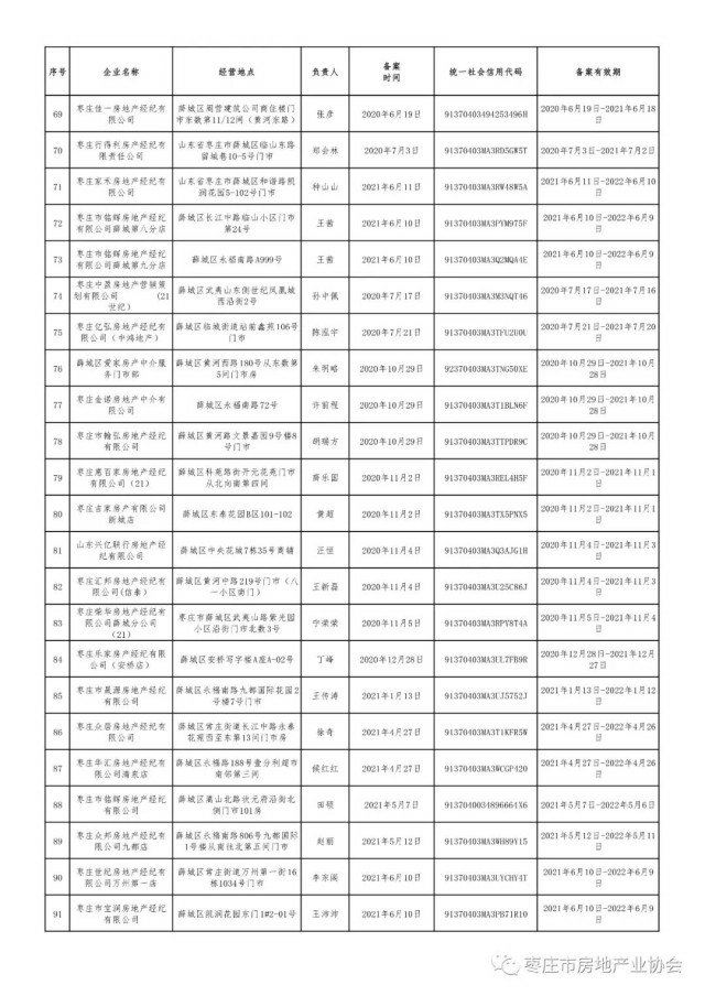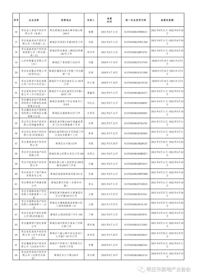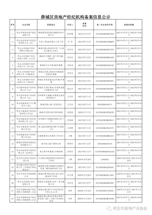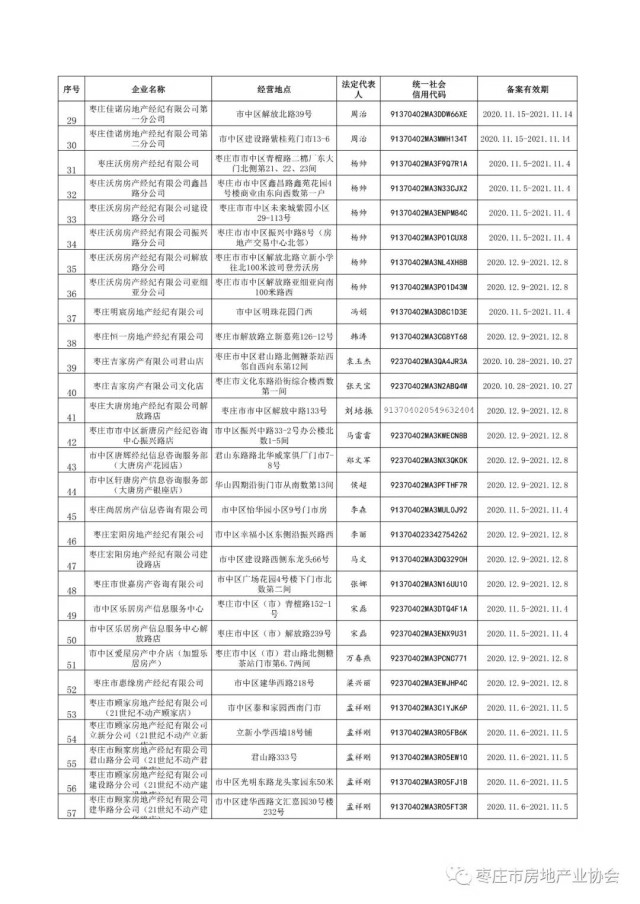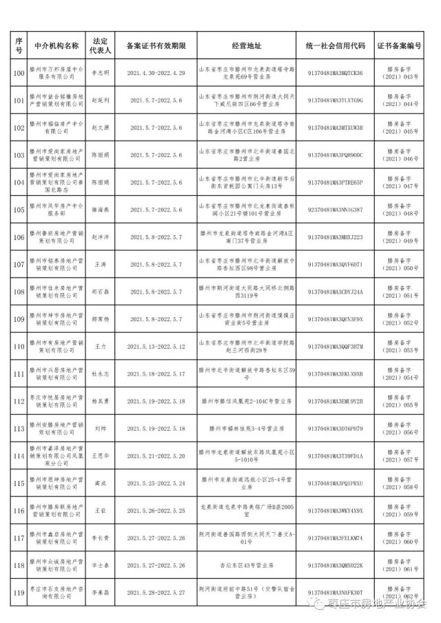 為切實加強我市房地產經紀機構管理,規范房地產經紀活動,保障房地產經紀活動當事人合法權益,維護房地產中介市場秩序,根據棗莊市住房和城鄉建設局《關于進一步加強房地產中介市場管理的通知》(棗住建字〔2020〕1號)文件精神,截至2021年6月15日,經各區(市)、棗莊高新區主管部門核準取得《棗莊市房地產經紀機構備案證書》的房地產經紀機構(門店)共416家,其中,滕州市155家,薛城區94家,山亭區23家,市中區86家,嶧城區20家,臺兒莊區32家,棗莊高新區6家,現予以公示。