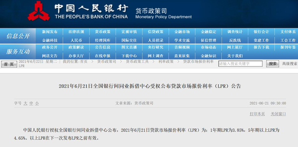 6月21日,中國人民銀行授權全國銀行間同業拆借中心公布,6月貸款市場報價利率(LPR)為1年期LPR為3.85%、5年期以上LPR為4.65%,LPR報價已經連續14個月“原地踏步”。