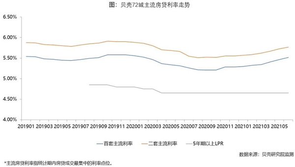 貝殼研究院日前發布的報告顯示,6月份其監測的72城主流首套房貸利率為5.52%,二套利率為5.77%,分別較5月上浮5個基點和4個基點。從放款周期來看,72城房貸平均放款周期為50天,較上月再延長2天。