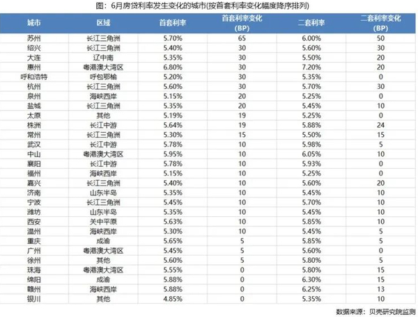 此外,在72個重點城市中,6月份有四成城市房貸利率上浮。其中,長三角區域房貸加息幅度較大。當月,長三角區域購房首套、二套利率分別提高11個、10個基點。其中,蘇州首套、二套房貸利率分別較上月上調65個、50個基點,上調幅度在所有城市中排名第一,紹興、杭州首套、二套放貸利率均提高30個基點,此外嘉興、常州、泉州等城市利率漲幅均相對較大。