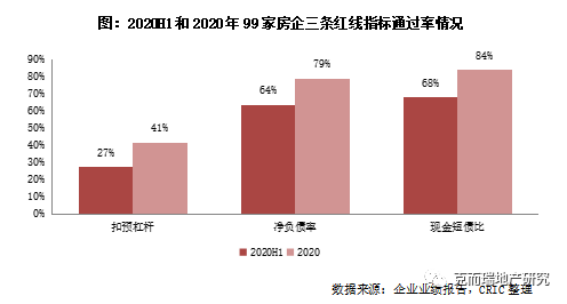 從三個指標的通過率來看,均有明顯的提高。2020年底現金短債比的通過率最高,達到了84%,相比2020年上半年提高了16個百分點。此外凈負債率通過率也同樣較高,達到了79%,比年中提高了15個百分點。相較之下,剔除預收款后的資產負債率的通過率僅有41%,多數房企仍未達標,但相比年中仍有14個百分點的提升。