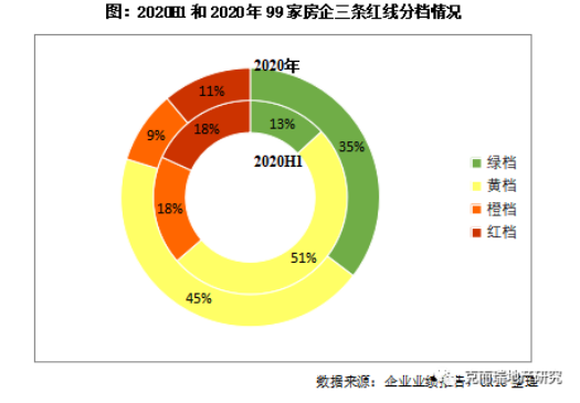 從不同的顏色檔次來看,2020年底處于綠檔的房企明顯擴容,占比相比年中的13%上升了22個百分點,達到了35%。黃檔房企占比下降,相比年中下降了6個百分點,至45%。此外橙檔、紅檔房企占比也有所下降,分別下降了9個及7個百分點至9%、11%。