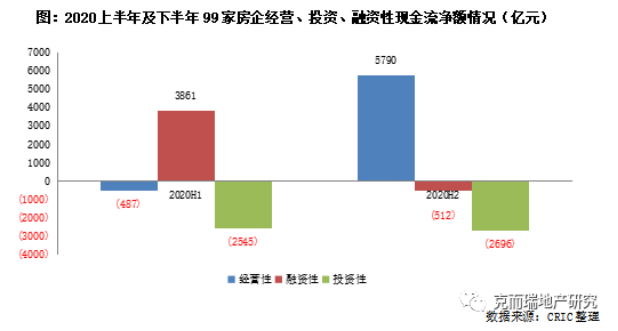 若從99家房企2020年上半年及下半年經營、投資、融資性現金流凈額變化來看,可以看出大多數房企于下半年加強銷售回款、控制投資,經營性現金流由負轉正至5790億元;而投資性現金流基本保持持平。與此同時,融資性現金流凈額呈現為凈流出,側面也說明房企加大了債務償還力度。