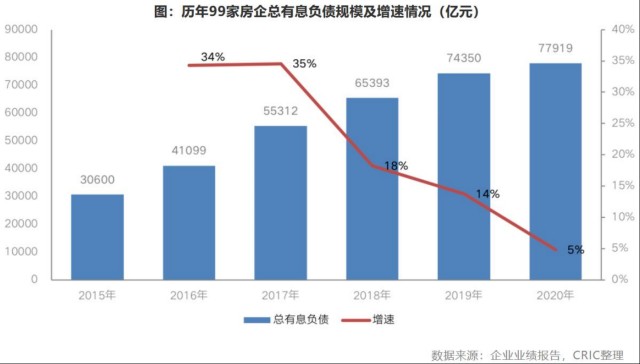 數據顯示,2020年末99家房企的總有息債規模為77919億元,相比2019年僅增長5%,相比2020年上半年末,更是下降1%。其中,有28家房企的總有息負債同比呈現下降,有32家同比增速不高于15%,兩者占比達約61%(2019年該比例為54%)。