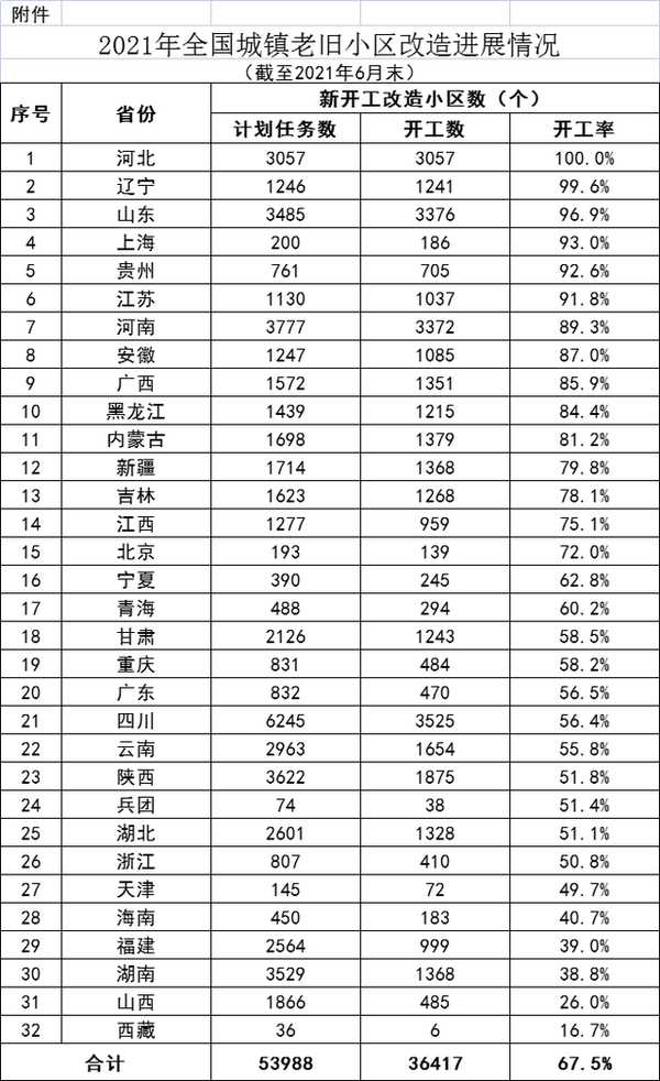 住建部指出,其中,開工進展較快的地區:河北(100%)、遼寧(99.6%)、山東(96.9%)、上海(93.0%)、貴州(92.6%)、江蘇(91.8%)。開工進展較慢的地區:天津(49.7%)、海南(40.7%)、福建(39.0%)、湖南(38.8%)、山西(26.0%)、西藏(16.7%)。