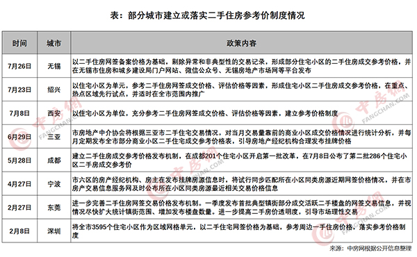 據中房網不完全統計,目前至少已有深圳、西安、成都、三亞、東莞、無錫、寧波、紹興等八個城市建立或實施了二手房成交參考價機制,且調控效果初顯。