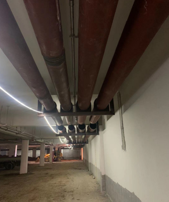 上圖為電力設備安裝,下圖為車庫暖通立管安裝