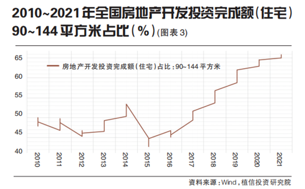 造成房價上漲預期剛性的首要原因是供需錯配。在中國傳統思想和文化中,房子是安居樂業的基礎。這種觀念一定程度上決定了國人擁有房產的意愿較為強烈。經過近四十年的經濟高速增長,我國城鎮居民家庭收入和財富出現了大幅增長。收入和財富的顯著增長為住房需求上升提供了堅實的基礎。調查數據顯示,2019年城鎮居民家庭擁有一套住房的家庭占比為58.4%,有兩套住房的占比為31.0%,有三套及以上住房的占比為10.5%,戶均擁有住房1.5套。1999~2019年,全國城鎮居民人均住宅面積從22平方米增加至39.8平方米。而2010年至今,全國房地產開發投資完成額(住宅)中,90~144平方米的占比保持穩步上升,今年以來已經超過65%,較2010年上升近20個百分點(圖表3)。供需兩端的數據皆表明,城鎮居民對住房的新增需求和改善需求持續增加,而房價上漲帶來的財富效應則反過來刺激了投資和投機需求增長。