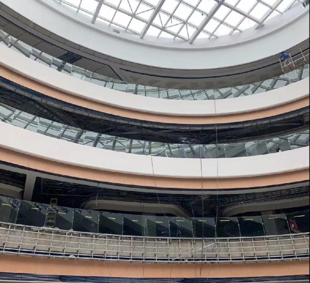 君瑞城購物中心中庭玻璃的安裝,讓購物中心內部的顏值“飆升”,商場內部在陽光下更加閃耀,建筑整體風格的展示已初有成效。