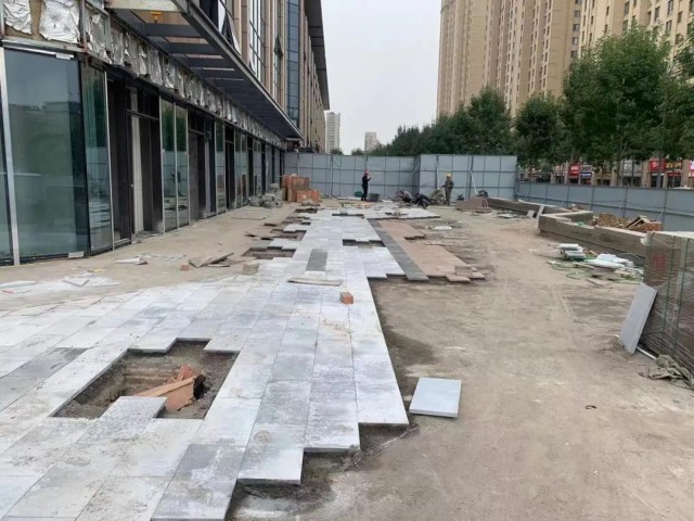 2#樓南側路面石材鋪設工作正在緊張進行,路面鋪設完畢后,將大大提升君瑞城購物中心周邊景觀的美感。