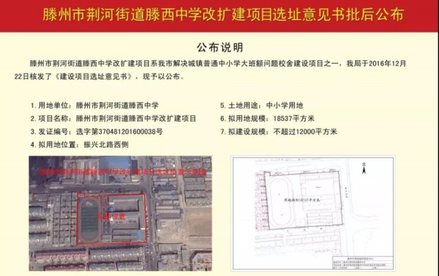 據了解,滕州市荊河街道滕西中學申報的滕州市荊河街道滕西中學改擴建項目設計方案已經審查,根據有關法律法規的規定,現對該項目進行建設工程設計方案公示、建設工程規劃許可批前公告。公示日期:2021年6月9日至2021年6月18日滕西中學改擴建工程總投資1.5億元,規劃可建設用地面積63501平方米,建成后的滕西中學建筑面積將達到39000平方米,新增學位1000個,全部建成后將成為城區占地面積和建筑面積最大的初級中學。同時滕西中學改擴建工程二期的實施也將為振興中路的全面建成提供必要條件。
