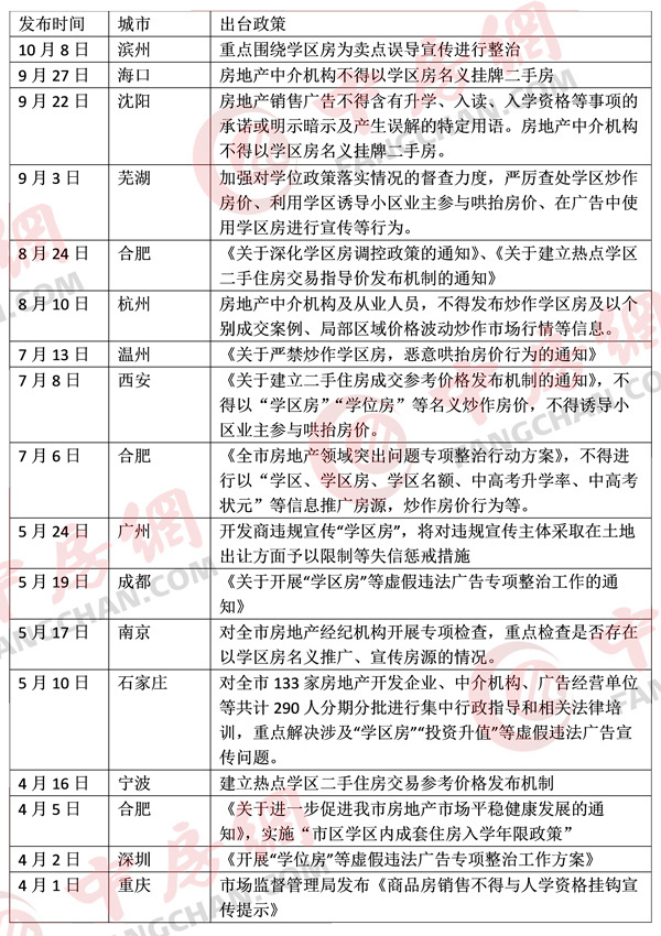 據中房網不完全統計,今年以來,北京、上海、廣州、深圳、重慶、西安、成都、南京、廈門、溫州、合肥、石家莊、杭州、海口、沈陽、蕪湖、濱州等17城均發布了相關政策整頓學區房炒作。
