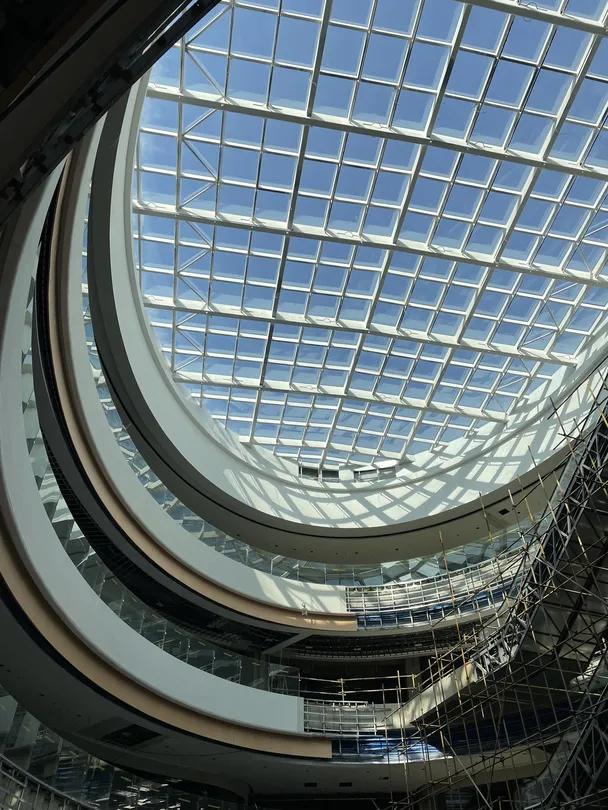 大商業北側幕墻玻璃正在安裝中,從北辛路觀去,建筑體的整體面貌依稀可見。玻璃幕墻倒映著冬日的藍天白云,大商業中心時尚大氣的外觀正一點點“扮靚”。