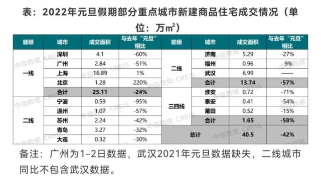 中指研究院數據顯示,元旦假期房地產市場延續了2021年末市場低溫態勢。全國重點監測城市新建商品住宅成交面積較去年同期下降42%,購房者觀望情緒濃厚,市場置業信心仍不足。具體來看,元旦期間,4個一線城市新建商品住宅累計成交25.11萬平方米,較去年同期下降24%。二線代表城市元旦期間新建商品住宅累計成交13.74萬平方米,同比下降57%;三四線代表城市累計成交1.65萬平方米,同比下降58%。