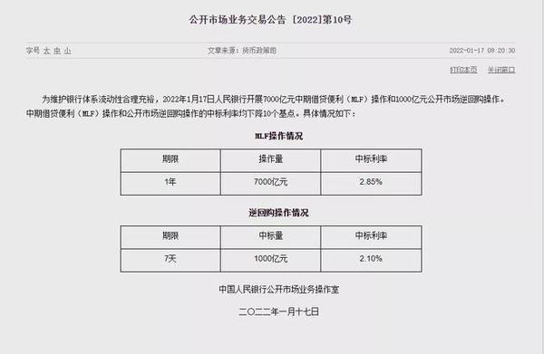 1月17日,央行發布消息,為維護銀行體系流動性合理充裕,2022年1月17日人民銀行開展7000億元中期借貸便利(MLF)操作和1000億元公開市場逆回購操作。中期借貸便利(MLF)操作和公開市場逆回購操作的中標利率均下降10個基點。降息后,7天逆回購利率降至2.1%,1年期MLF利率降至2.85%,這是自2020年3月調降7天逆回購利率和4月調降1年期MLF利率后的首次降低政策利率。