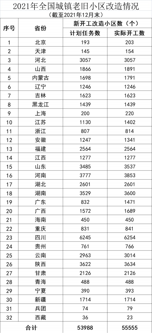 1月24日,住房和城鄉建設部城市建設司發布的“2021年全國城鎮老舊小區改造情況(截至2021年12月末)”數據顯示,2021年全國實際新開工改造城鎮老舊小區5.56萬個。