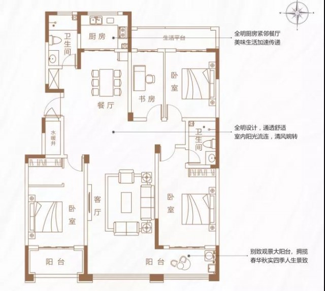 最極致的空間造詣,便是將陽光引入每個房間。超大陽臺設計,南北通透,陽光與清風輕盈入戶。