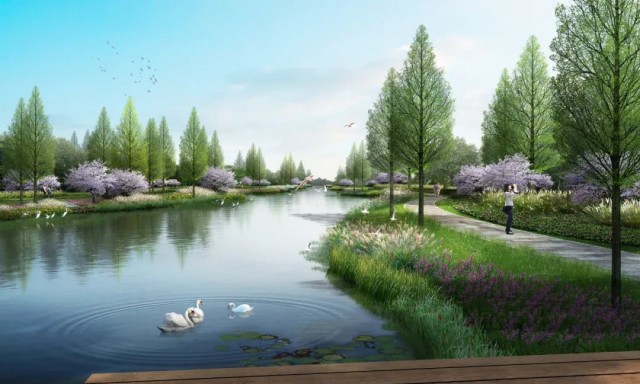 國企興滕深耕滕西,更懂滕西。搶先布局——柳岸風和,擇址于馮河流域科創未來區段,這一區域將人文、藝術融合到生態景觀中,提高藝術性、在地性、實用性,讓周圍的居民參與進來。并以多點帶面,輻射周邊空間范圍的設計手法,利用5G等高科技技術營造一個集產業、文化、創意、休閑、游賞、體驗多位一體、共榮共生、相得益彰的活態復合空間。通過景觀系統南北鏈接城、河,構成了南北河湖一體的生態走廊,東西向以馮河為中心,構成東西科創未來軸。