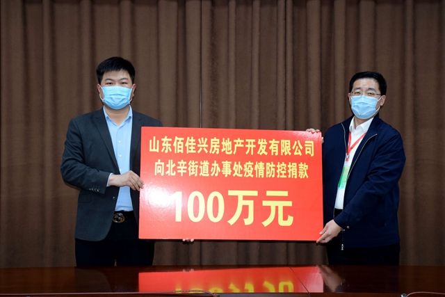 正當北辛街道上下萬眾一心、眾志成城,全力以赴投入到疫情防控阻擊戰的關鍵時刻,山東佰佳興房地產有限公司慷慨解囊,捐款100萬元支持北辛疫情防控,以實際行動彰顯社會擔當,助力疫情防控工作。