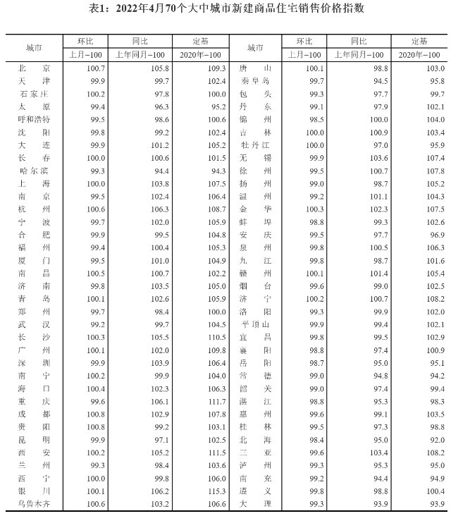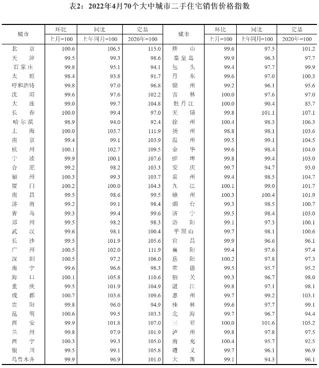 國家統計局今日(5月18日)發布的《70個大中城市商品住宅銷售價格變動情況》顯示,2022年4月份70個大中城市新建商品住宅價格環比上漲的城市有18個,環比下跌的城市有47個,5個城市環比持平,上個月這一數字分別為29個、38個和3個。二手住宅方面,環比上漲的城市有15個,環比下跌的城市有50個,5個城市持平,上個月這一數字分別為21個、45個和4個。
