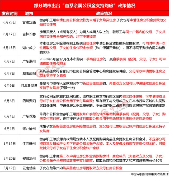 近期,甘肅定西、吉林長春、湖北咸寧、廣東潮州、湖南邵陽、河北秦皇島、四川資陽、廣東珠海、河北滄州等多地發布樓市新政,其中提到的“家人買房可互用公積金”的舉措,頗為吸睛。