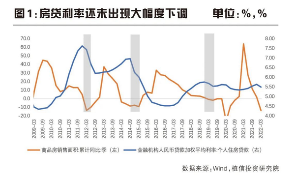 首先,迄今為止,住房貸款利率還未出現大幅度下調。回顧2010年以來的地產周期,2012——2013年和2014——2016年期間,房貸利率下調最大幅度分別高達142bp和244bp,銷售面積增速從-13.6%和-9.2%上升至37.1%和33.1%,漲幅高達50.7和42.3個百分點。2022年一季度末,個人住房貸款加權平均利率出現下調,但較去年年末高點僅下調14bp,下調幅度遠不及2010年后前兩輪周期。