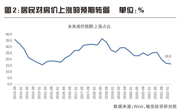 再次,購房信心偏弱。一方面,居民對未來收入的預期轉弱,限制了人們加杠桿買房。央行2022年一季度調查數據顯示,我國城鎮居民未來收入信心指數為50%,處于歷史較低水平。另一方面,居民對房價上漲的預期轉弱?!百I漲不買跌”的購房心理在房地產下行周期中加強了對商品房銷售的沖擊。數據顯示,截至2022年一季度,樣本城鎮居民持有房價上漲預期占比為16.3%,為2015年6月以來的最低值。