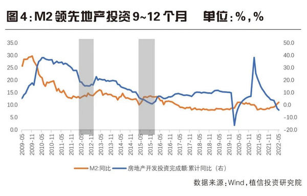 從流動性的角度看,M2同比增速持續回升。M2同比增速是地產周期較好的領先指標。在過去的地產周期中,M2領先房地產投資時間并不一致,有一個季度的,也有三個季度的。2021年12月,M2同比增速再次回到9%以上,結束了之前連續10個月下行的趨勢;2022年5月M2增速達到11.1%,較上月上漲0.6個百分點,意味著房地產開發投資在今年三季度企穩的可能性較大。